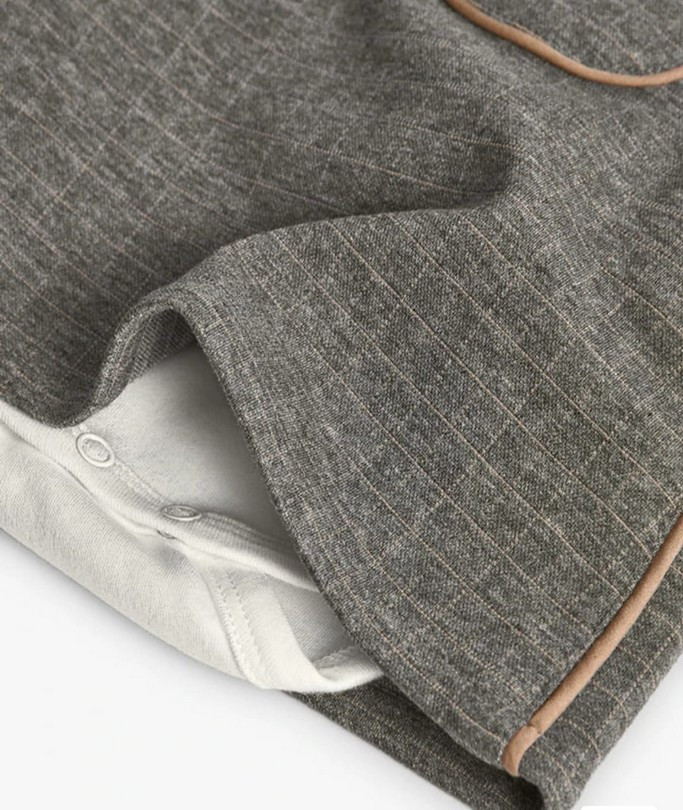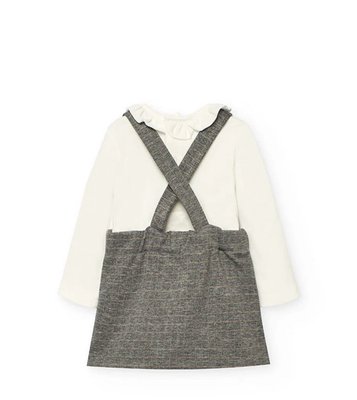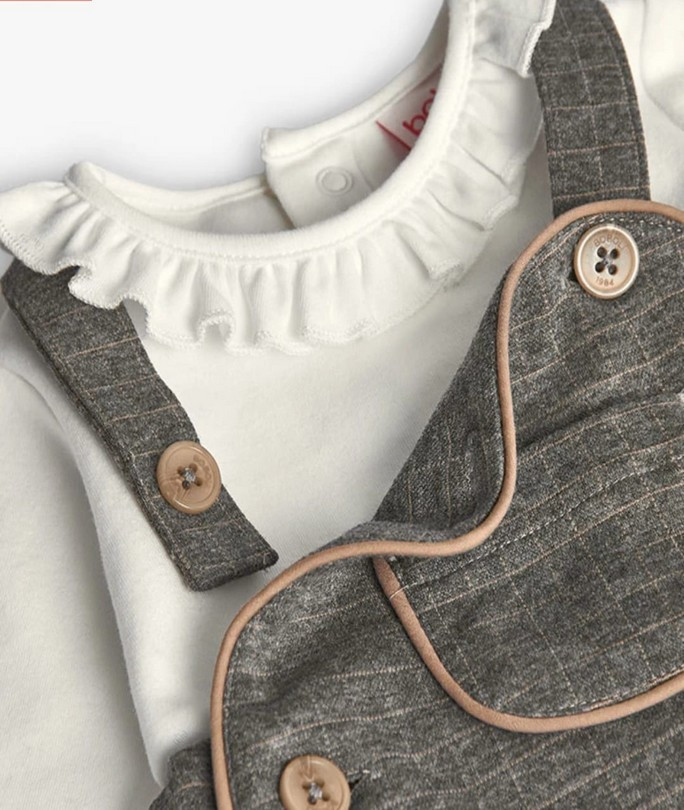 Vestido pichi para bebé con blusa a juego, una propuesta cómoda y elegante para el día a día. El pichi presenta un estampado clásico en tonos neutros, detalles de botones decorativos y ribetes en contraste que aportan un acabado refinado. La blusa incluida es de manga larga y cuenta con un cuello volante que complementa el look con un toque dulce. Un conjunto práctico, suave y perfecto para cualquier ocasión.