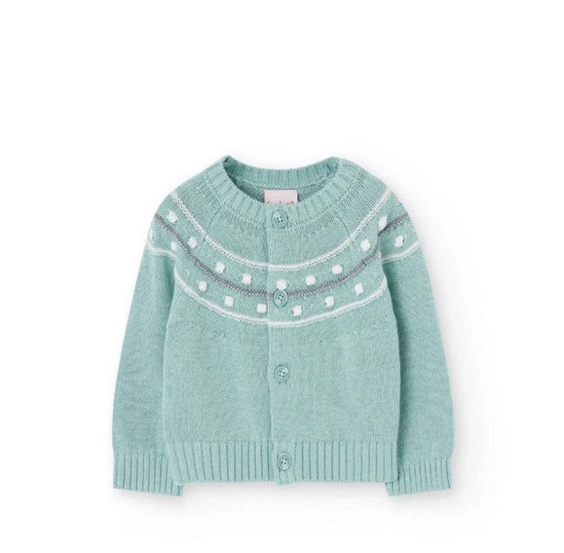 Chaqueta de punto para bebé Boboli, suave, cálida y perfecta para los días más frescos. Su diseño en color verde agua destaca por el canesú decorado con detalles jacquard en blanco y gris, aportando un estilo delicado y muy combinable. Incluye cierre frontal con botones, puños y bajos de canalé para un ajuste cómodo y seguro.