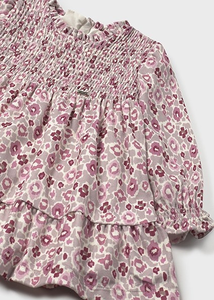 Un vestido encantador y elegante para las más pequeñas. Confeccionado en suave terciopelo estampado floral , destaca por su diseño con pechera nido de abeja elástica, que se adapta cómodamente al cuerpo, y falda de vuelo con caída ligera.