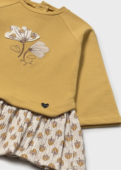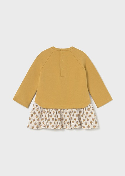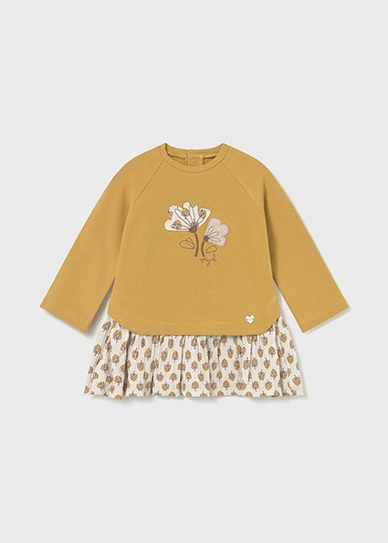 Este vestido con efecto dos piezas combina la practicidad de una sudadera con la dulzura de una falda estampada. Perfecto para el día a día, pero con ese toque especial que lo convierte en una prenda única en el armario de tu peque.