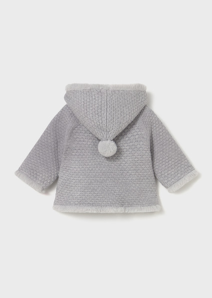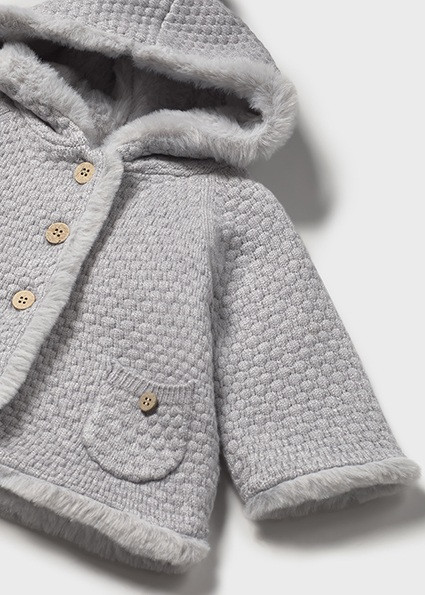 Con su textura delicada, botones de madera y gorrito con pompón, tu pequeño no solo estará abrigado ¡estará irresistible!