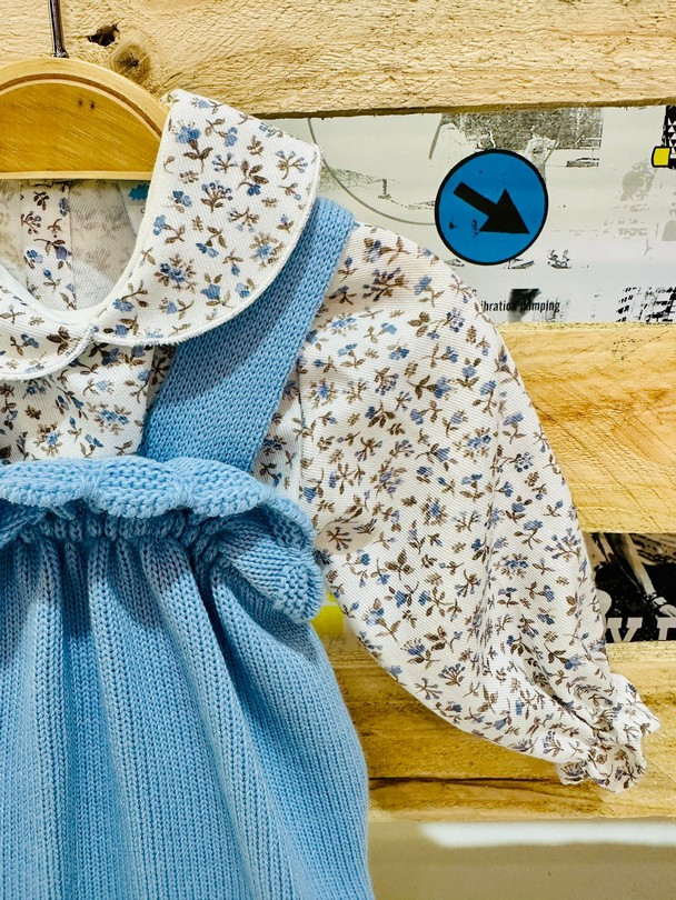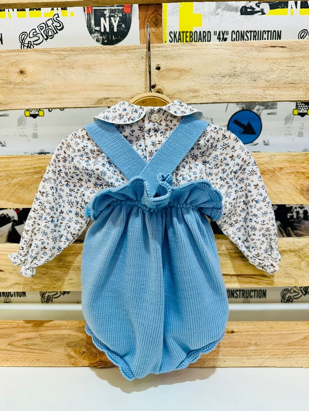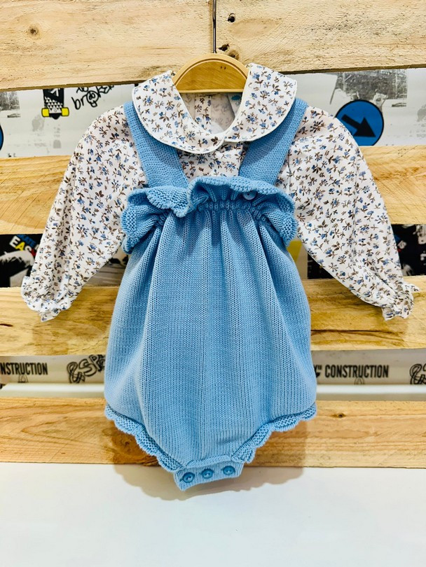 Compuesto por ranita de punto azul con tirantes y detalles de volantes, confeccionada en un tejido suave y confortable.