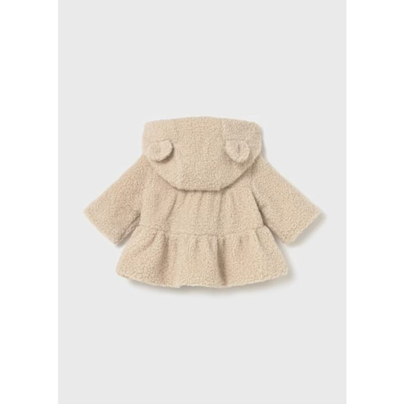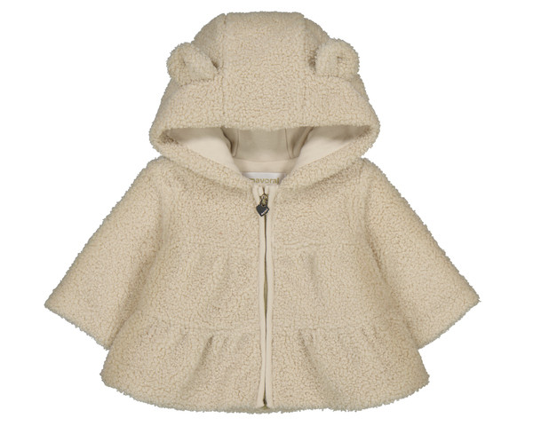 Confeccionada en tejido efecto borreguito, esta chaqueta con capucha y orejitas es puro abrigo y ternura. Su diseño práctico con cremallera frontal hace que sea fácil de poner y quitar, mientras que el volante en el bajo le da un toque delicado y especial.