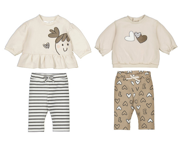 Ambos conjuntos están confeccionados en tejido suave, cálido y muy cómodo, pensado para acompañar cada movimiento del bebé. Perfectos para usar tanto en casa como para pasear, siempre con estilo y confort.