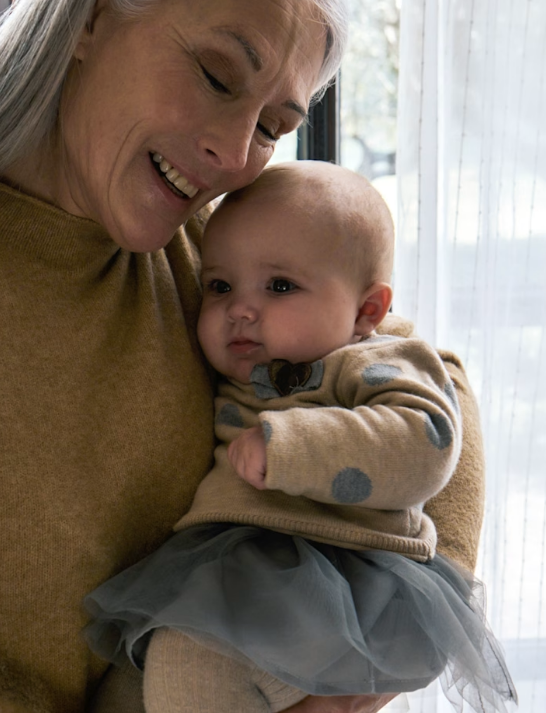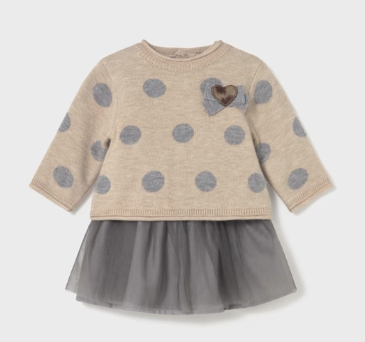Su parte superior en punto beige con lunares grises aporta un estilo dulce y atemporal, mientras que la falda de tul en tono gris oscuro le da un toque sofisticado ideal para cualquier ocasión especial.