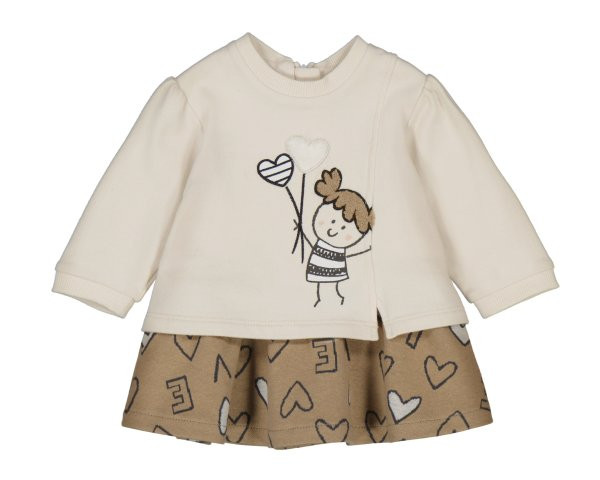 Un diseño lleno de ternura para las más pequeñas ??. Este precioso vestido de bebé combina un cuerpo en color crudo con dibujo bordado de niña y globo en forma de corazón con una falda en tono camel estampada con corazones y letras.
