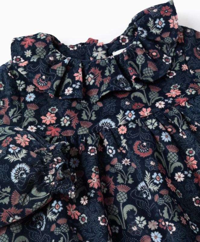 Una blusa tan dulce como cómoda. Confeccionada en pana fina y suave, presenta un delicado estampado floral en tonos otoñales y un volante en el cuello que le aporta un toque romántico.