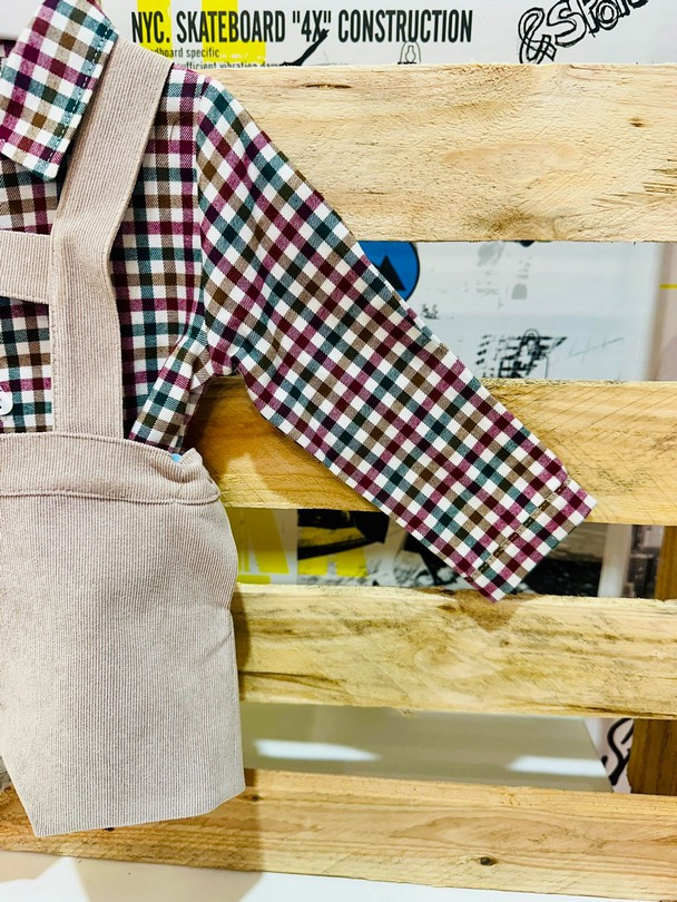 El conjunto se completa con un peto corto de pana fina en color beige, con tirantes cruzados y cierre con botones, ideal para un look tradicional y encantador.