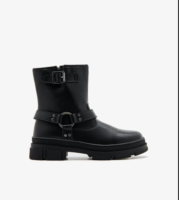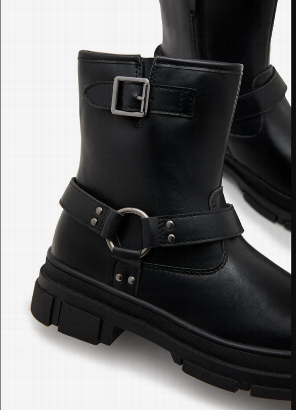 Dale un toque rebelde y moderno a tus looks con esta bota estilo biker. Su diseño en color negro con detalles de hebillas metálicas y correa decorativa la convierten en una opción versátil y con personalidad.