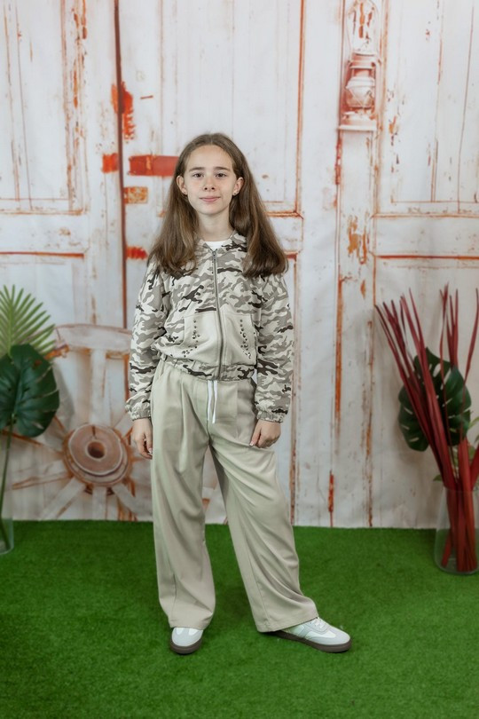 Sudadera iDO para niña (10-16 años), confeccionada en felpa de algodón elástico de otoño. Modelo con capucha y estampado de camuflaje. Adornada con tachuelas y piedras preciosas.