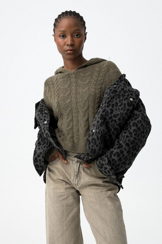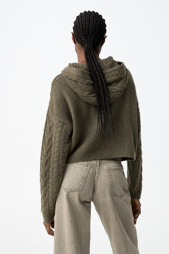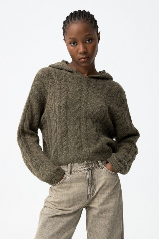 Jersey de chica trenzado con capucha, de tacto suave y estilo actual. Corte ligeramente crop, perfecto para combinar con vaqueros o pantalones de tiro alto. Disponible en verde y también en beige, dos colores fáciles de llevar y muy versátiles para el día a día.