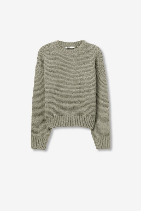 Jersey de punto para chica, suave, calentito y con textura gruesa. Diseño corto y relajado, perfecto para looks cómodos con vaqueros o pantalones anchos. Tiene un estilo muy actual y favorecedor. Disponible también en verde.