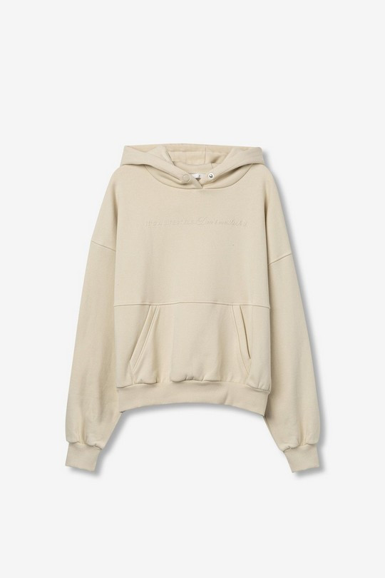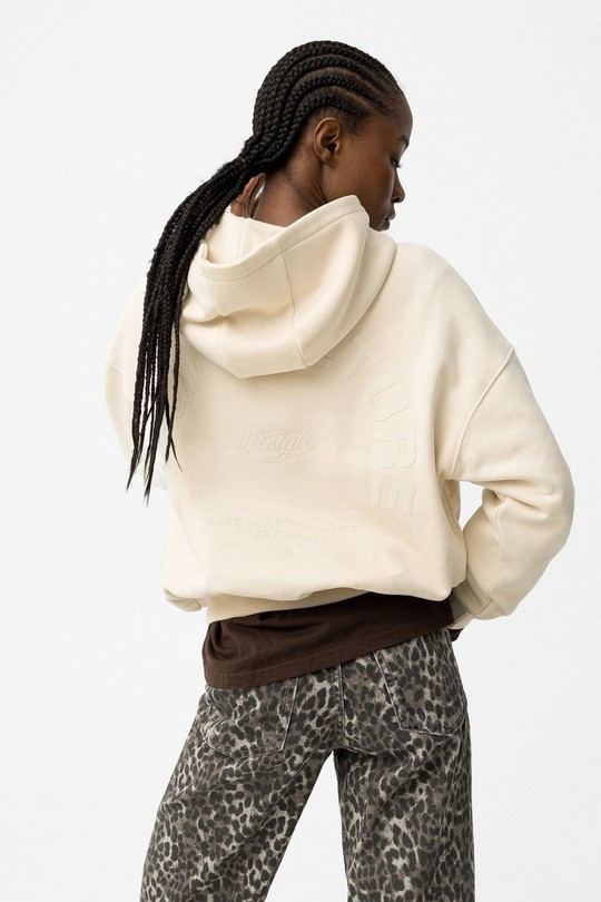 Sudadera de chica en tono crudo, suave, cómoda y con capucha. Lleva un texto bordado en relieve en el pecho que le da un toque moderno y minimalista. Diseño relajado, bolsillos tipo canguro y acabado perfecto para looks casual de diario. Disponible también en más colores.