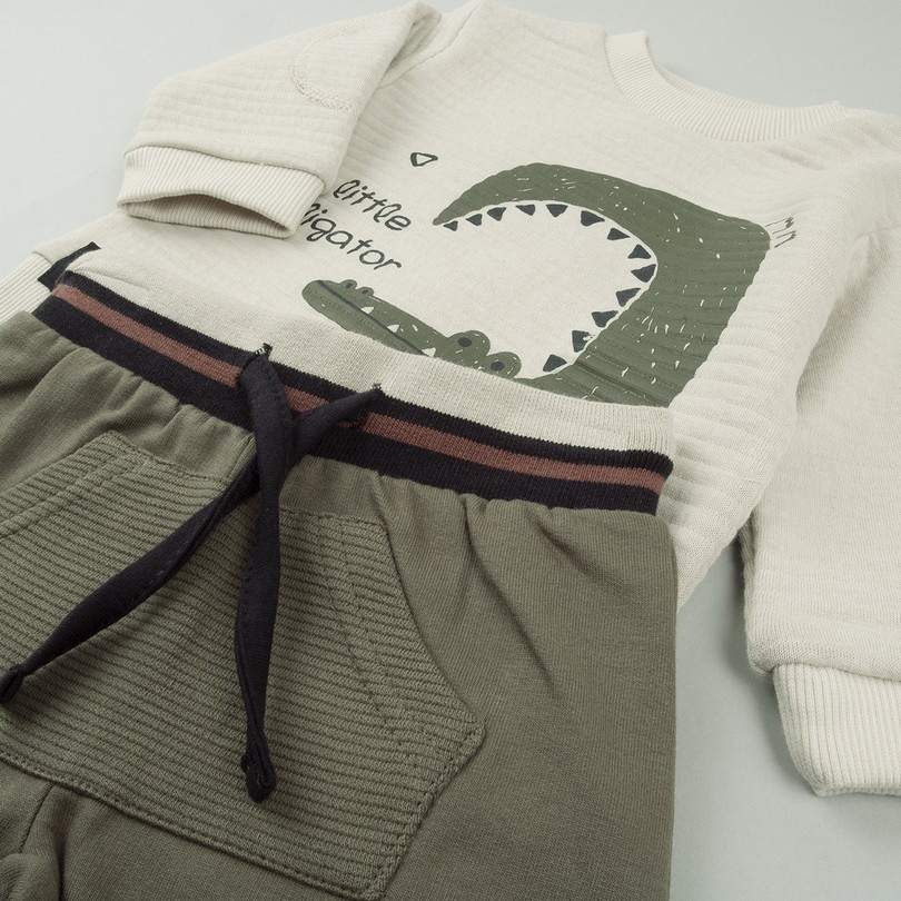 Este conjunto de dos piezas para bebé niño es perfecto para un look tierno y divertido. Incluye sudadera en color crema con textura ligera, estampado de cocodrilo y frase Little Alligator, y pantalón jogger a juego en color verde oliva con cintura elástica y cordón decorativo.
