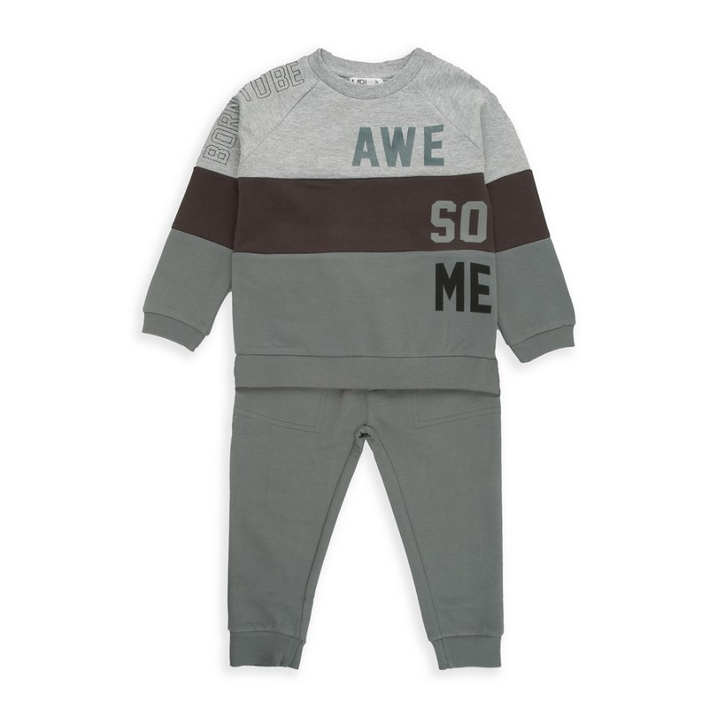 Este conjunto para niño combina estilo moderno y comodidad para el día a día. Incluye sudadera de manga larga en tonos gris claro, marrón y gris verdoso con diseño a bloques de color y mensaje Awesome en la parte frontal, y pantalón jogger a juego en color gris verdoso con cintura elástica para un ajuste cómodo.