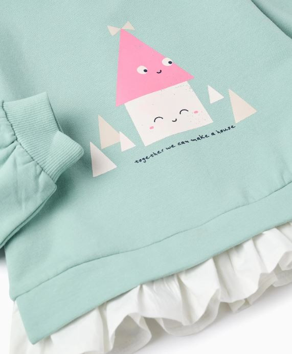 Conjunto para bebé niña compuesto por sudadera de manga larga en color verde agua y leggings a juego. La sudadera tiene un original estampado frontal con figuras geométricas de colores y un detalle de volante en el bajo que aporta un toque femenino y divertido.
