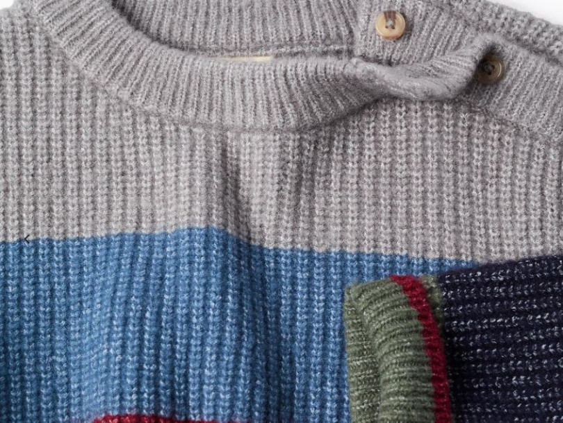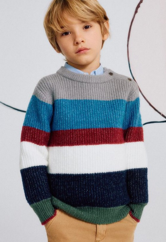 Jersey de punto con diseño de rayas multicolor en tonos gris, azul, burdeos, blanco y verde. Con cuello redondo y cierre con botones en el hombro, ofrece un ajuste cómodo y un estilo alegre. Su tejido cálido y suave lo convierte en una prenda ideal para los días fríos.