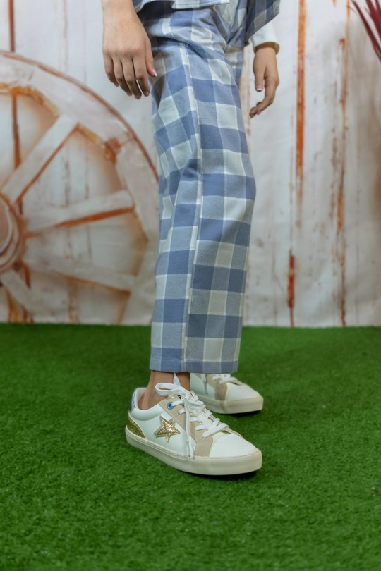Pantalones iDO para niña de 3 a 8 años, confeccionados en sarga 100 % algodón con tacto melocotón. Cintura con volantes y estampado de cuadros. Con forro de algodón.