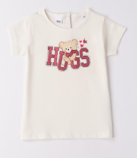 Camiseta blanca de manga corta con estampado de osito y letras decoradas en tonos fucsias, perfecta para combinar sola o bajo la sudadera.