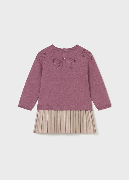 Un diseño elegante y cómodo que combina lo mejor del punto con el estilo de un vestido ?. Este modelo presenta un cuerpo de punto en color burdeos con detalles calados en el pecho, y una falda plisada en tono beige, que aporta movimiento y un aire sofisticado.