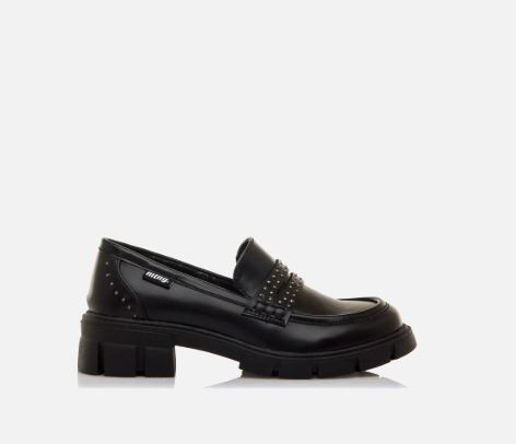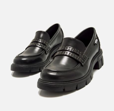 Los mocasines negros con suela track son la tendencia que no puede faltar en tu armario. Fabricados en material resistente con acabado brillante, destacan por su diseño moderno con tira decorativa de tachuelas metálicas y suela gruesa dentada que aporta comodidad, altura y un estilo urbano muy actual.