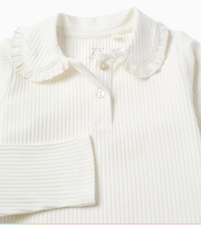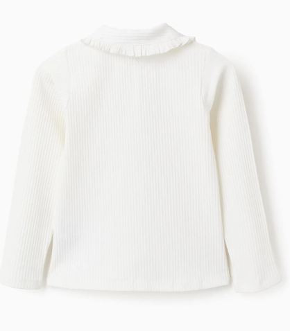 Un básico con encanto. Esta camiseta de canalé blanco con cuello de volante aporta un toque delicado y elegante a cualquier look.