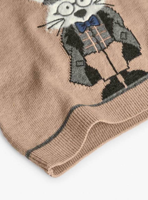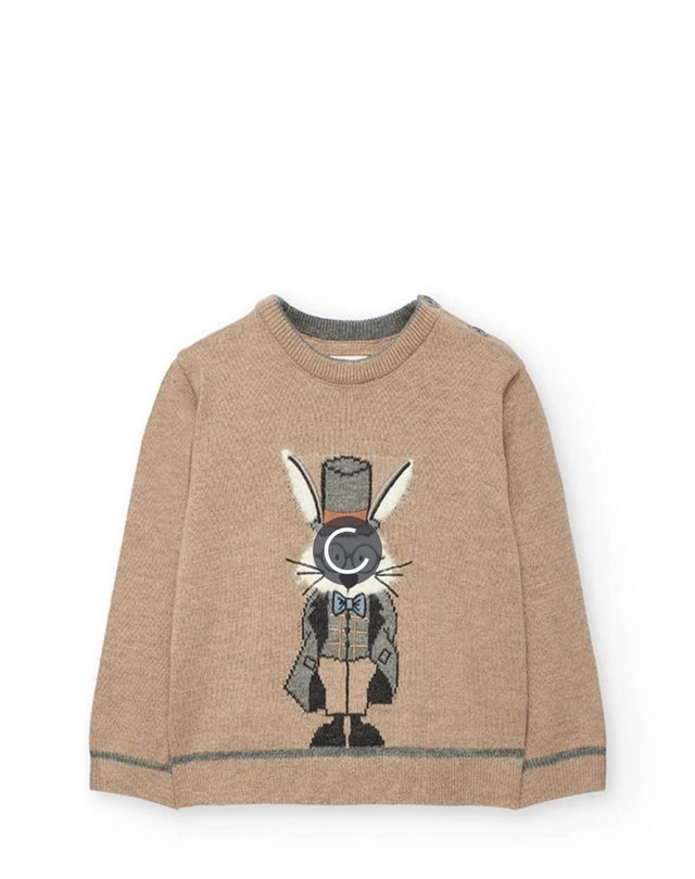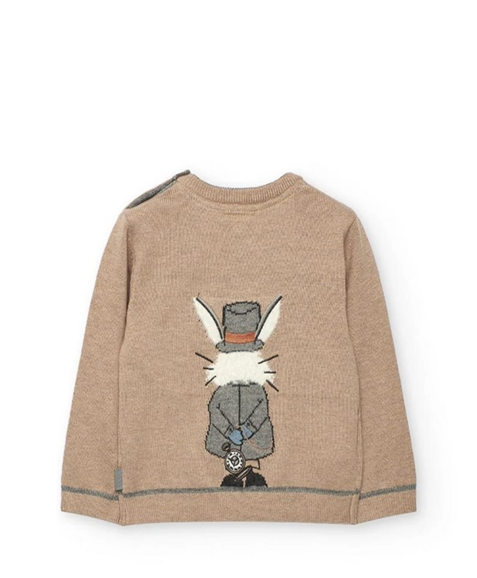 Jersey de niño en punto suave y cálido, ideal para el invierno. Presenta un original dibujo frontal de un conejo vestido con chaqué, sombrero de copa y pajarita, aportando un toque divertido y elegante al look.
