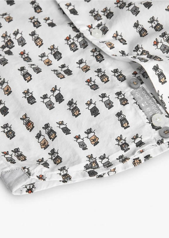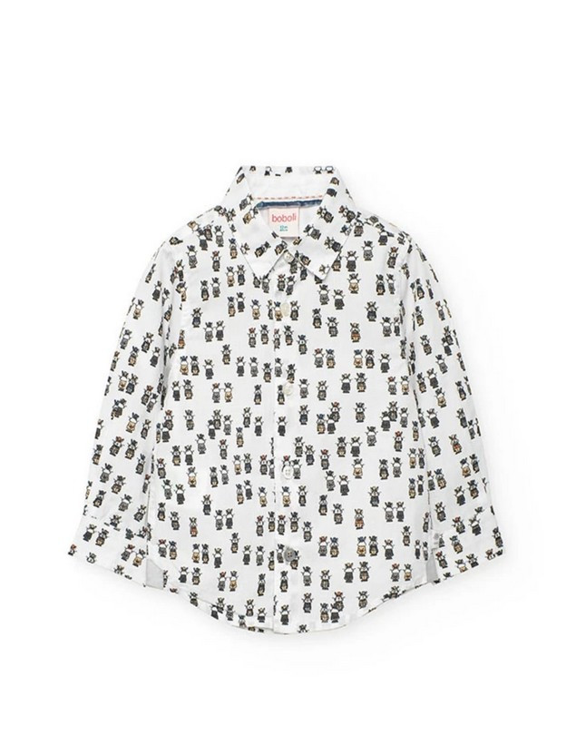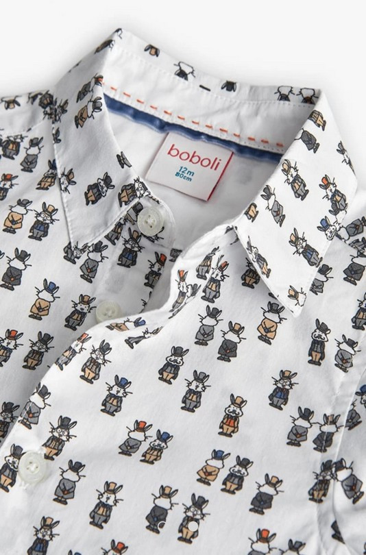 Camisa de niño en tejido suave y ligero, perfecta para looks cómodos y con estilo. Presenta un divertido estampado integral de pequeños conejos vestidos, que aporta un toque original y diferente a la prenda.