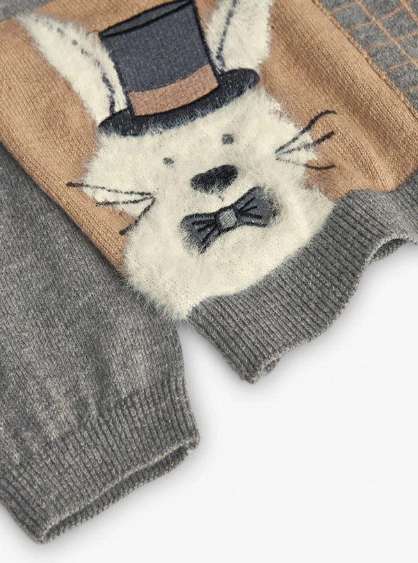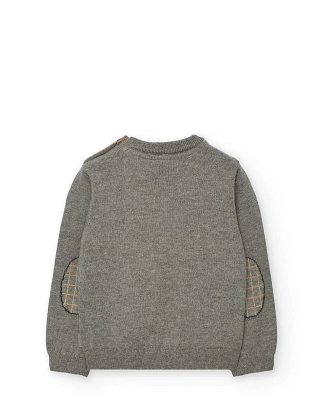 Jersey de niño confeccionado en punto suave y cálido, perfecto para los días fríos. Presenta un diseño a cuadros en tonos grises y camel, combinado con un divertido dibujo de un conejo con sombrero y pajarita, que aporta un toque original y encantador. Incorpora botones en el hombro para facilitar el vestir.