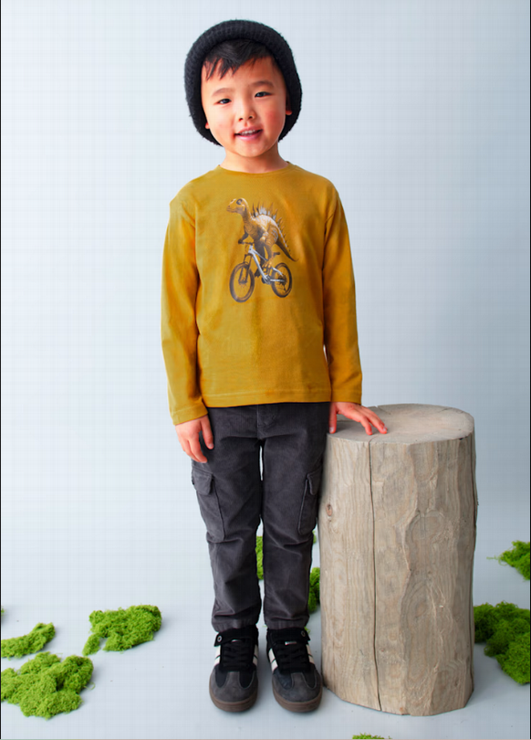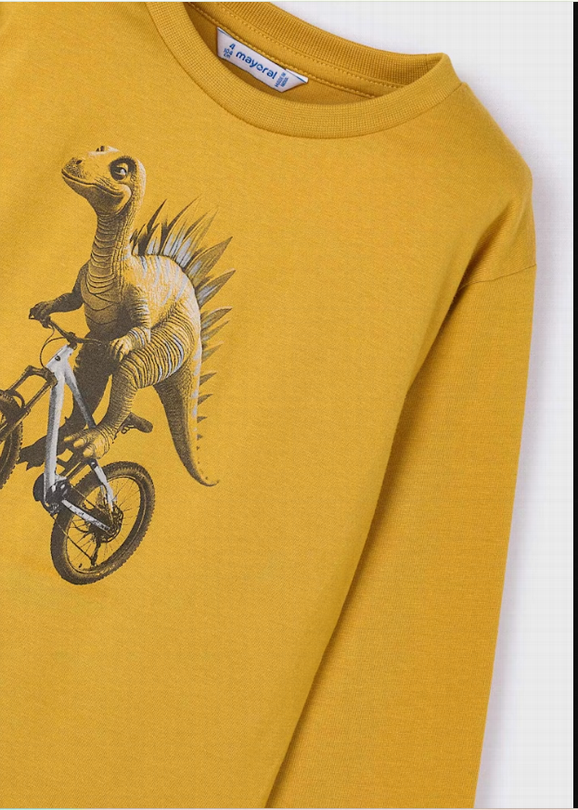 Una prenda divertida y original que encantará a los más pequeños. Esta camiseta de manga larga en color mostaza destaca por su estampado único de un dinosaurio en bicicleta, ideal para acompañar el día a día con estilo y alegría.