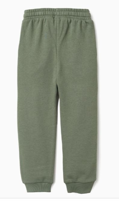 Pantalón de chándal en color verde caqui, con cintura elástica ajustable con cordón y puños acanalados. Incluye bolsillos laterales y pequeño detalle estampado en una pernera. Su tejido suave y cálido lo convierte en una prenda ideal para el día a día y momentos de juego.