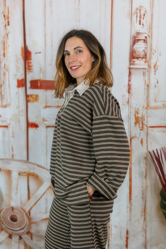 Luce un look cómodo y elegante con este conjunto en punto color chocolate con delicadas rayas horizontales en beige. La parte superior oversize cuenta con un cuello camisero en tela, aportando un toque sofisticado y estructurado, mientras que el pantalón ancho completa el conjunto con comodidad y estilo relajado.