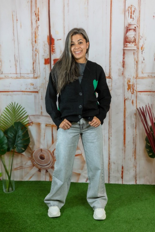 Dale un toque único a tus looks con esta chaqueta de punto con cierre de botones. En la espalda, presenta un diseño con letras en tonos tostados, beige y verde, mientras que en la parte delantera destaca un pequeño detalle de corazón en verde, creando un equilibrio perfecto entre diversión y estilo.